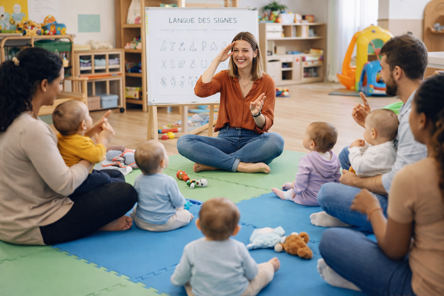 Découvrir les éléments de la classe en L.S.F, connaître des comptines avec la méthode « bébé signe ».